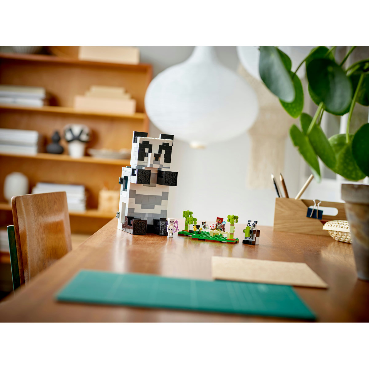 Casa construibilă, cu 3 etaje, în formă de urs panda se deschide în partea din spate şi permite copiilor să aibă acces la camerele mobilate din interior. Structura articulată, incluzând şi capul, fac ca această casă-panda să poată fi poziţionată stând pe toate cele patru picioare sau şezând. În fiecare caz, interioarele camerelor pot fi reconfigurate corespunzător. Personajele sunt un explorator de junglă, un panda, un pui de panda şi un schelet ostil cu care să lupte copiii. În afara structurii principale se află o junglă cu bambuşi, unde jucătorii se pot bucura de activitatea lor preferată din Minecraft: oferirea de tort urşilor panda. Pentru mai multă distracţie digitală, aplicaţia LEGO Builder oferă instrumente intuitive de zoom şi rotire care permit copiilor să-şi vizualizeze modelul în timp ce-l construiesc.