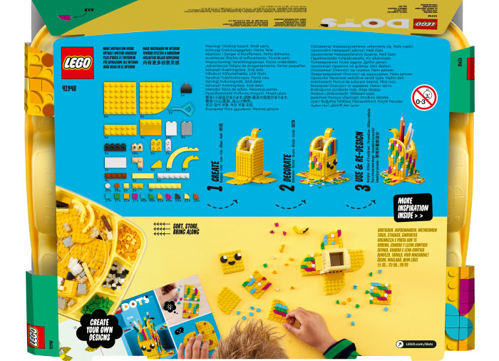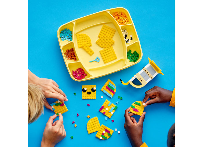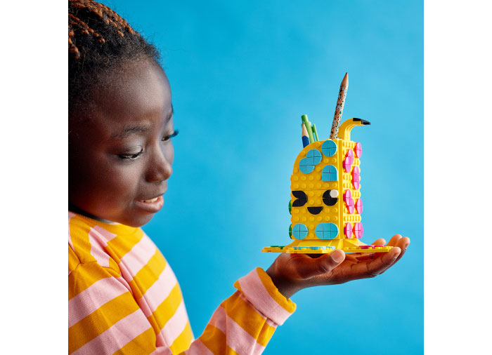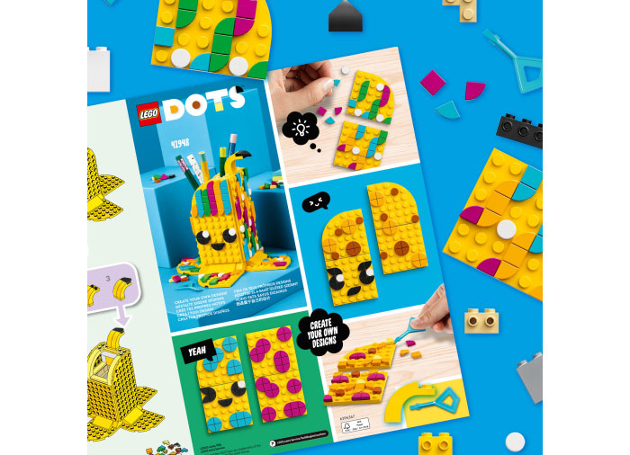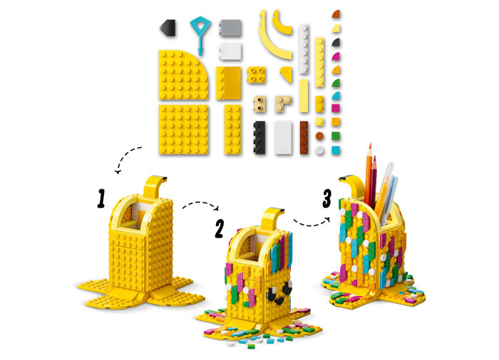 Distrează-te pe cinste cu această banană simpatică LEGO® DOTS! Asamblează suportul pentru pixuri şi apoi apucă-te de decorat. Alege banana veselă în culori vii şi chip zâmbitor, transform-o într-o banană veche şi morocănoasă cu pete, sau ia o pungă DOTS Extra seria 6 (vândută separat) şi creează ceva nou. Apoi pune suportul pentru pixuri pe birou sau pe un raft, şi foloseşte-l!