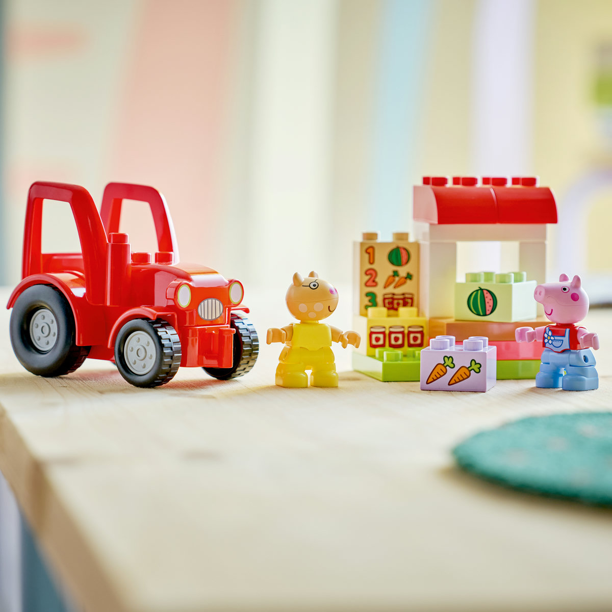 Acest set oferă copilaţilor o mulime de oportunităi de învăare ţi dezvoltare. Observând ţi imitând scene din serial, cei mici îţi pot dezvolta abilităi cognitive precum rezolvarea de probleme ţi memoria. Micii constructori îţi folosesc abilităile motorii fine pentru a asambla tractorul ţi a construi taraba. Setul include un meniu decorat cu pepene, morcovi ţi borcane de gem. Cei mici pot exersa recunoaţterea numerelor ţi asocierea lor pentru a găsi cărămizile decorate corespunzătoare. Setul conine 18 piese.